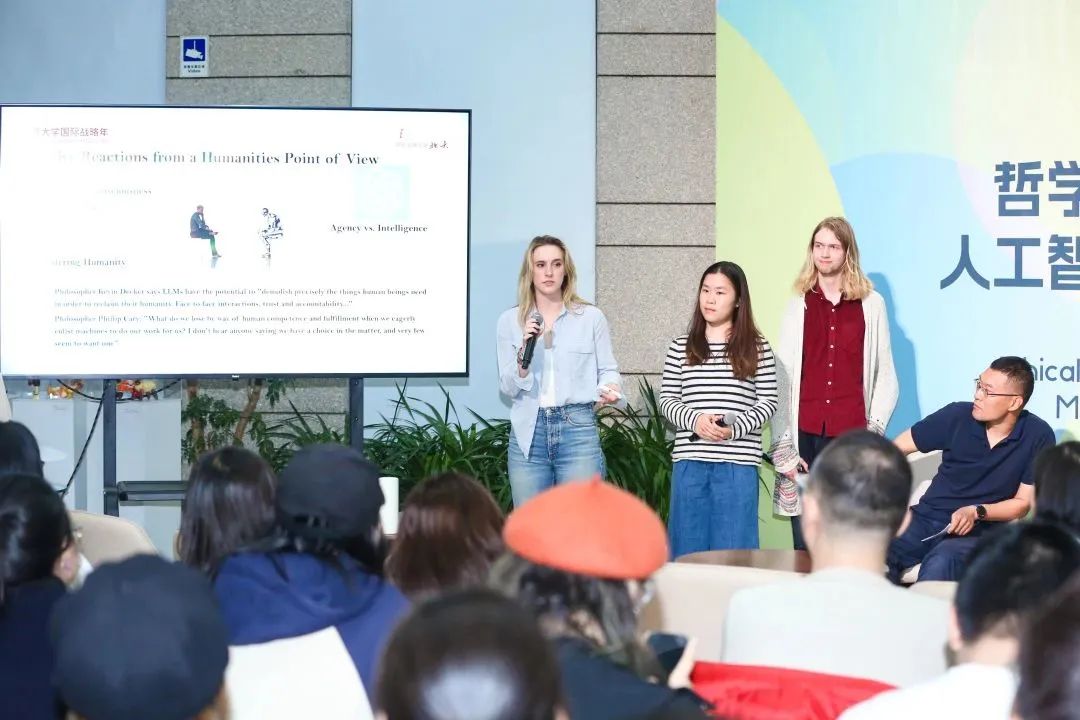 科普环节结束后,正式进入与谈人对话环节。对话围绕大语言模型和人工智能的技术原理、社会影响与未来走向,从“可靠性(A facade of reliability?)、效率和质量(A trade-off: higher efficiency, lower quality?)和前景发展(A blessing or a curse?)”三方面主题具体展开。针对训练偏见(bias in training)以及虚假信息(misinformation),以及“大语言模型是否越来越能解决用户的需求,从而被人类信任”等问题,师生分享了自己的见解。现阶段大语言模型越来越能实现个体需求,转变速度也是令人震惊的,特别是纠错功能的出现。其次,探讨了大语言模型在教育中的运用以及机器与人类服务的区别。与谈者提到,人类的辩证思考能力与社会经验似乎是机器尚无法习得的,但对于一些重复性工作,如交由机器完成,实际上是为人类赢得了时间以处理更加擅长或更有价值的事务,从这个角度来看,或许我们应在审慎的同时,以一个更加积极的视角看待当前技术的发展。与谈者同时提到,人工智能当前仍处于发展阶段,我们可以给予其更多发展与成长的空间。