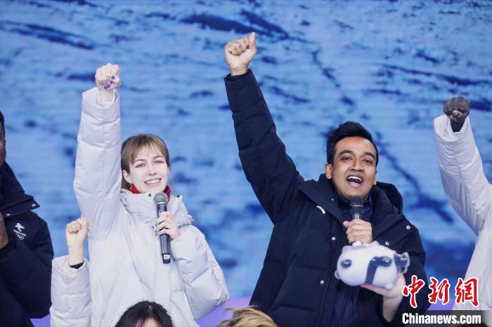 图为爱丽克斯(左一)在北京大学冬奥志愿者出征仪式上表演节目。 受访者供图